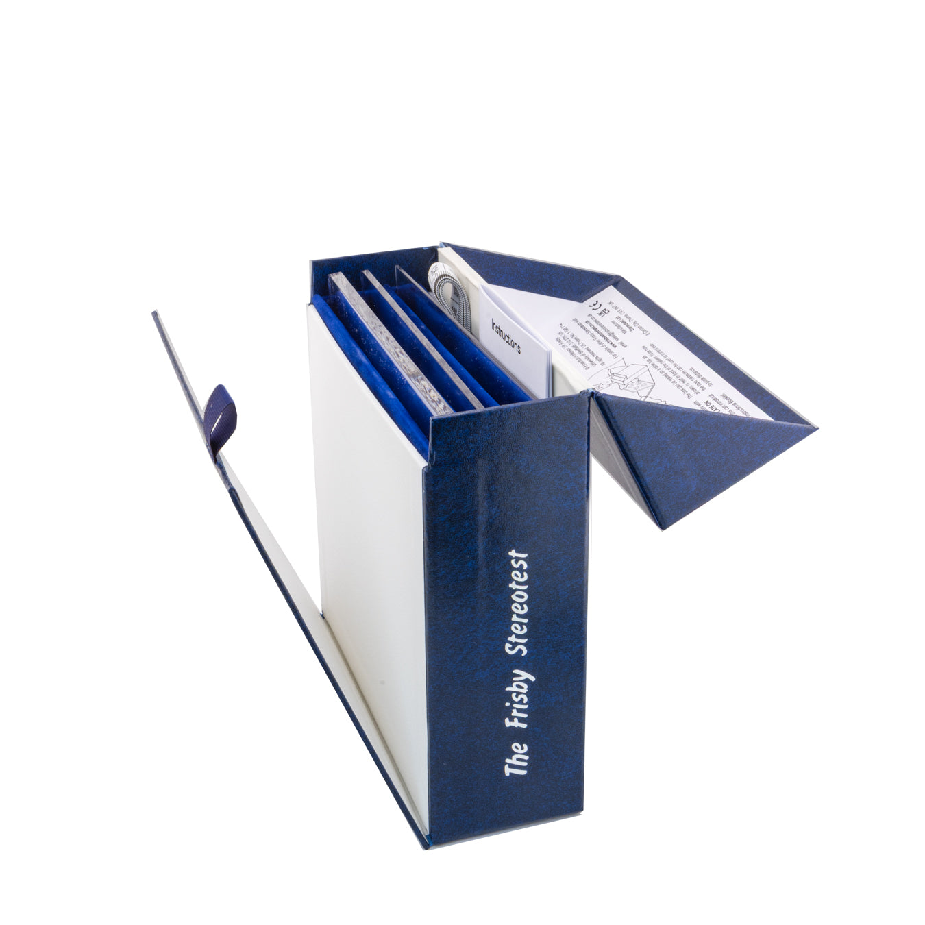 The Frisby Near Stereotest replacement box without plates. The box stores the plates, and the box's fold-down flap provides the clear background used in the testing procedure.